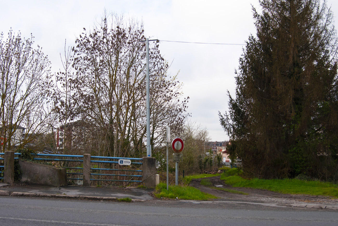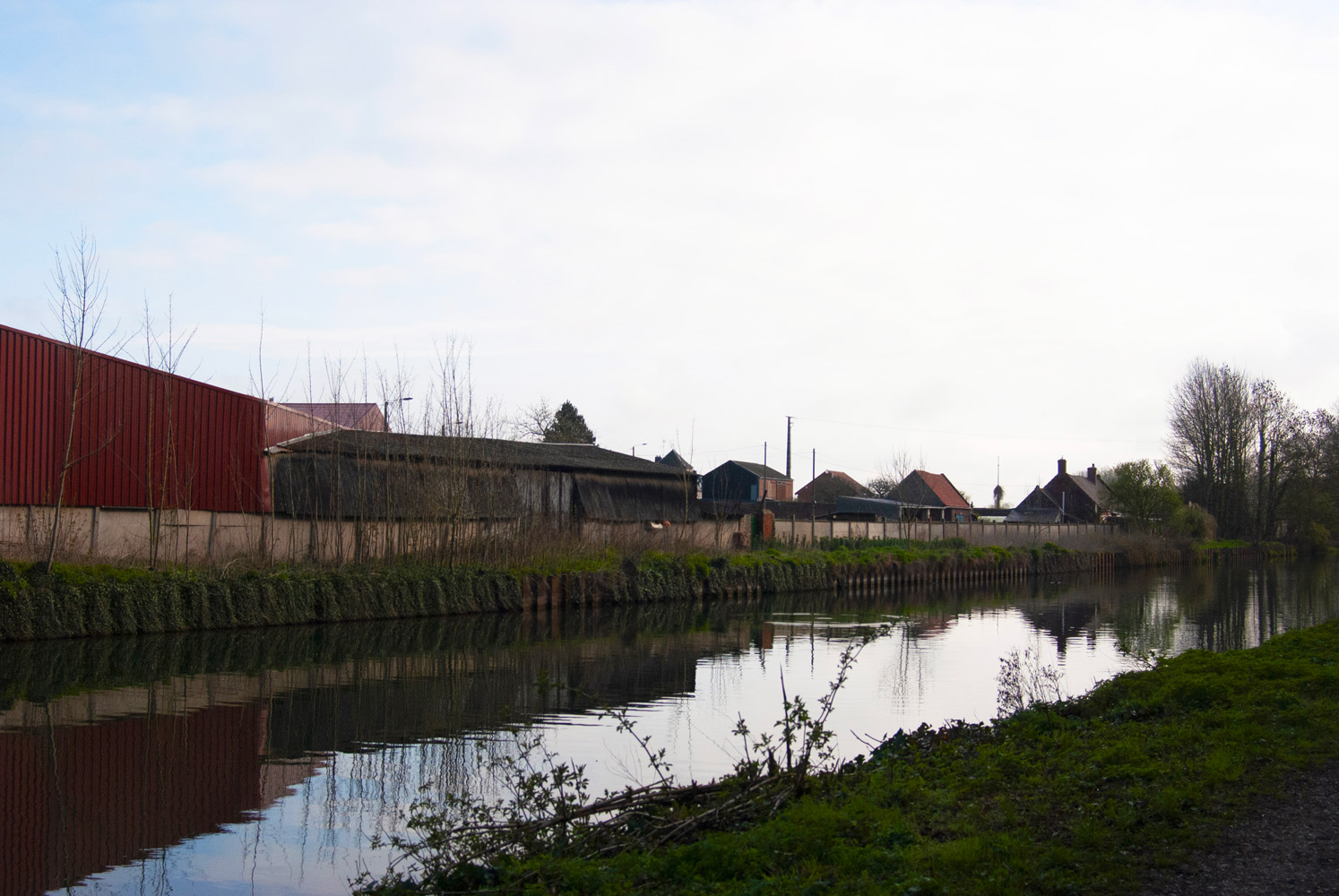 The Escaut Canal divides the city of Cambrai into two parts. Along its entire length are houses, vegetation, and factories.
