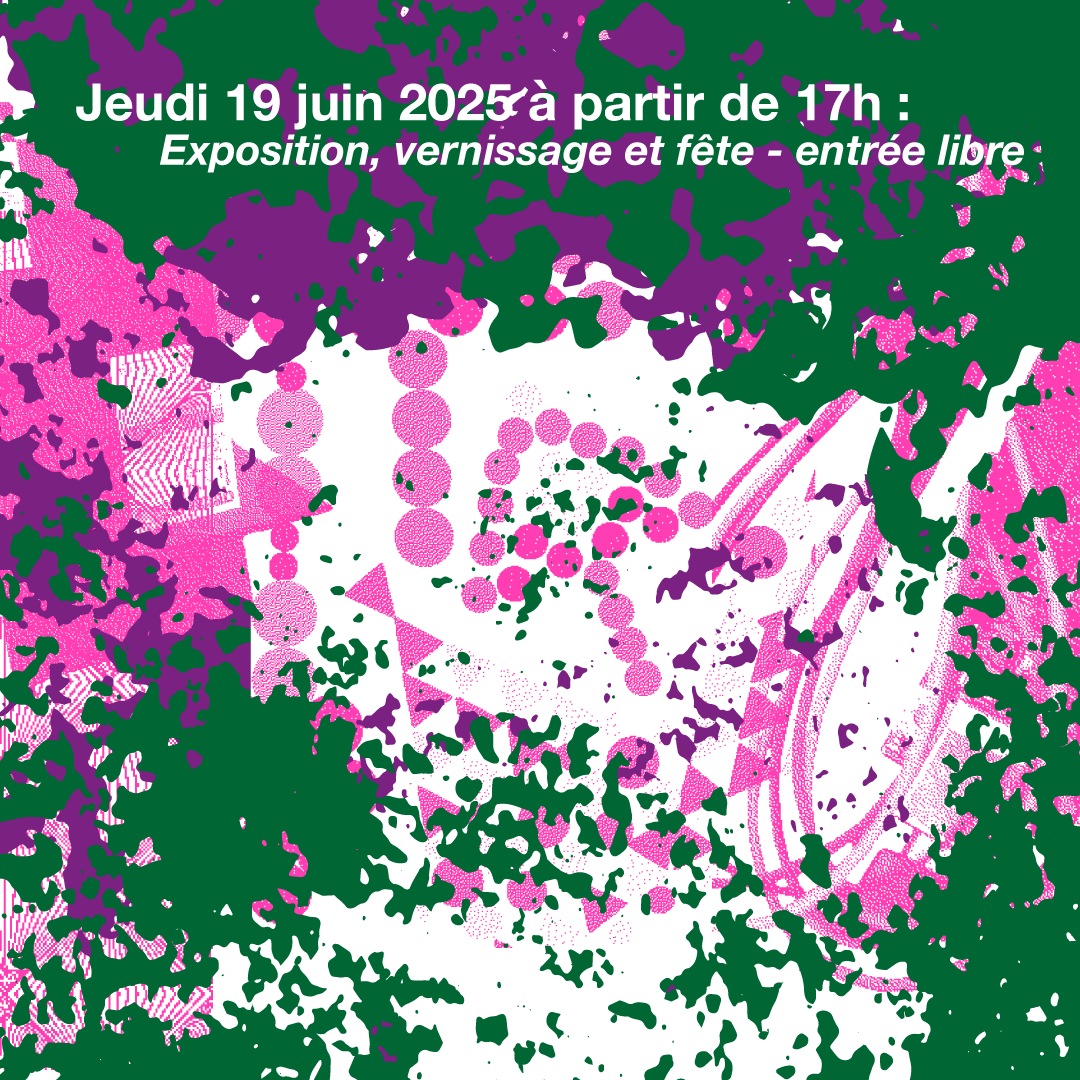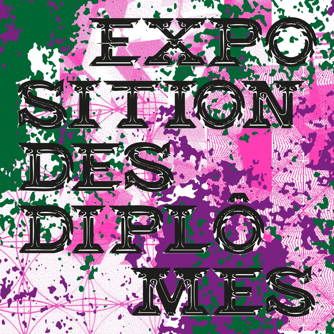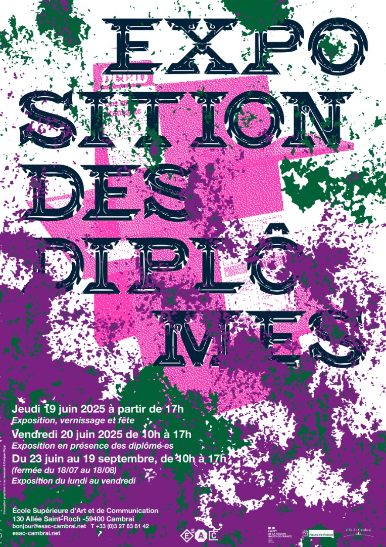 L'affiche et ses déclinaisons, réalisées en binôme, annoncent l'exposition des diplômes (2025) présente à l'Ecole Supérieure d'Art et de Communication de Cambrai pendant les vacances estivales. L'image du fond est une photo d'un dispositif d'un des sept diplômes (qui retranscrit les liens entre graphisme et numérique). Les cartons d’invitation ont été imprimés dans une entreprise locale, en trois tons directs du nuancier pantone : rose fluo, violet et vert.