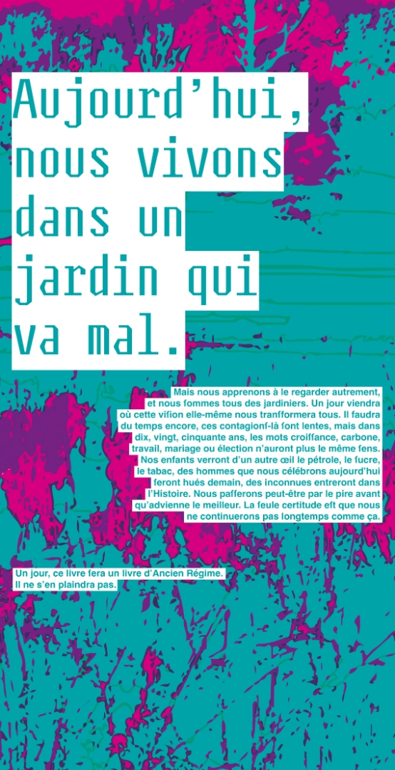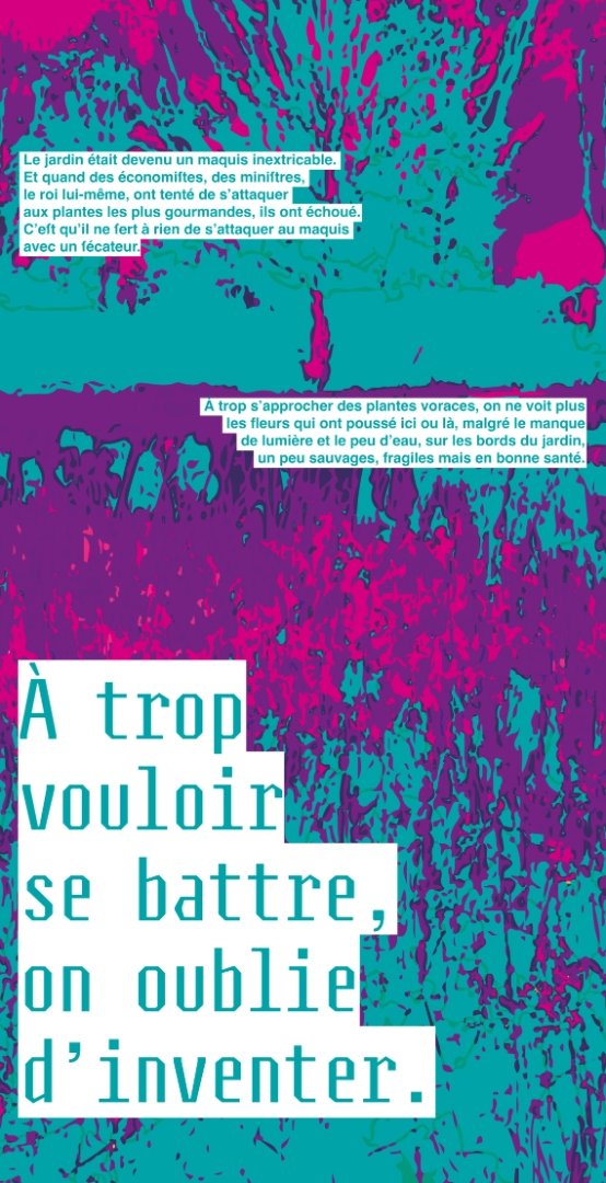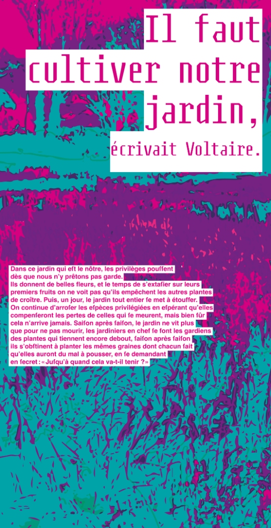 Diagrams are graphical representations of individuals in society, often using socio-economic criteria that are classificatory and not necessarily representative of cultural and social diversity. This installation proposes to shake things up by mixing up “categories” as it pleases! Six posters with excerpts from the end of the book