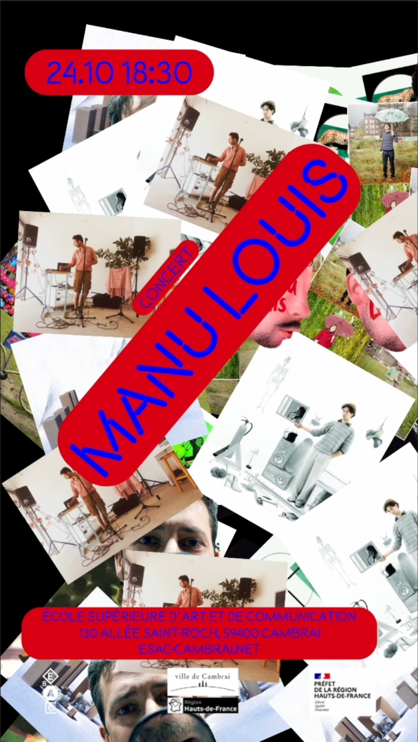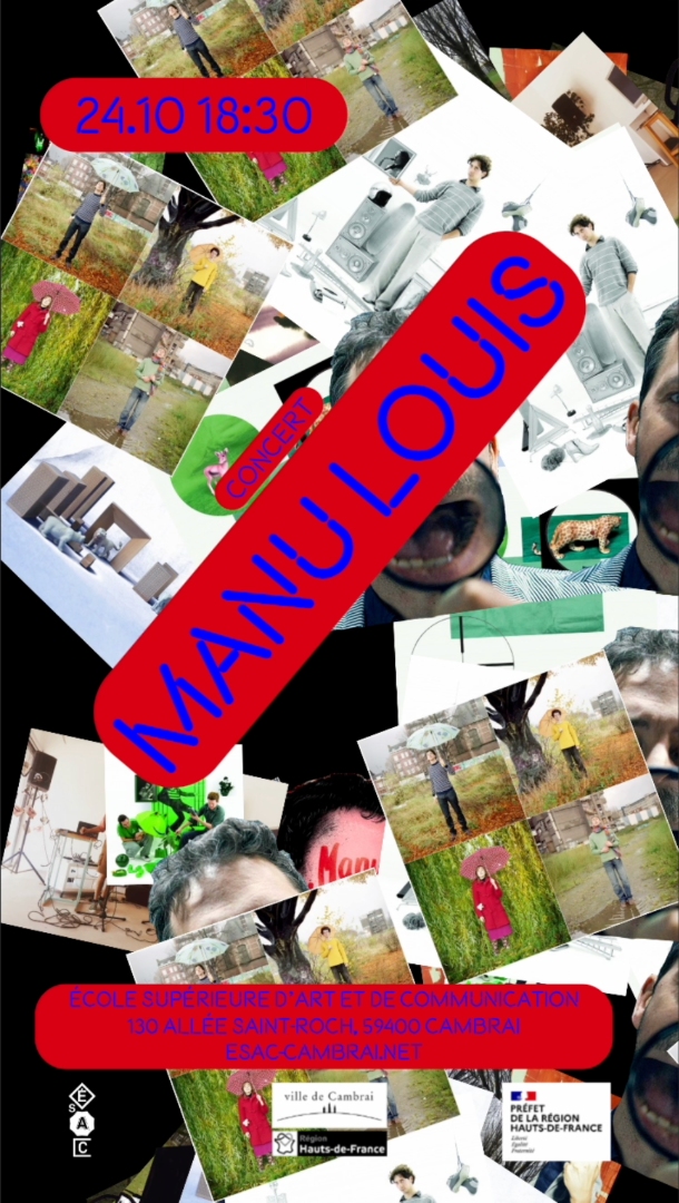 The poster announces the arrival of Manu Louis, Belgian musician, singer, and composer, at the Cambrai School of Art and Communication. It refreshes after a few seconds, revealing a new random collage of the musician's album covers. These are mixed together in much the same way as musical genres are blended in the artist's productions.