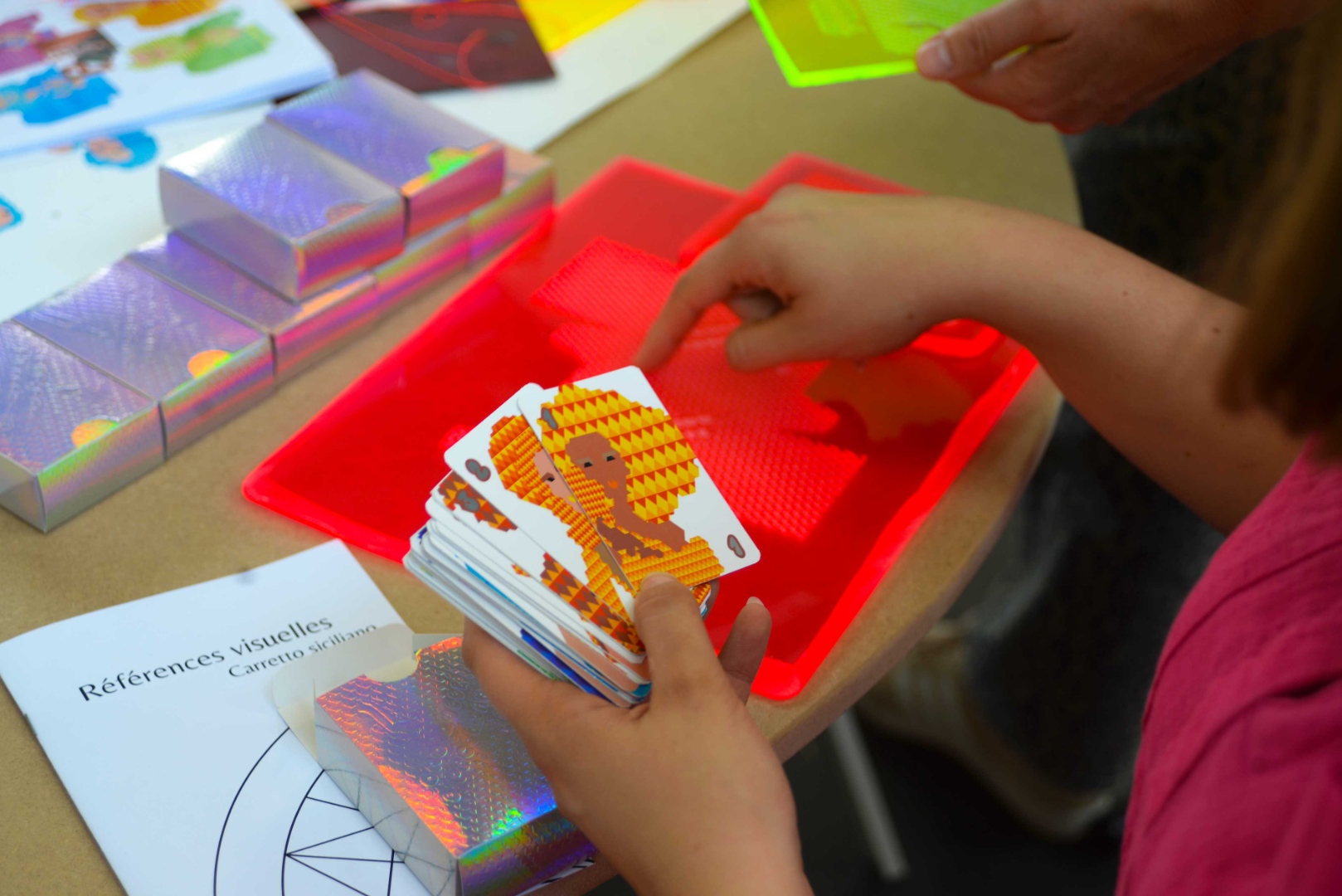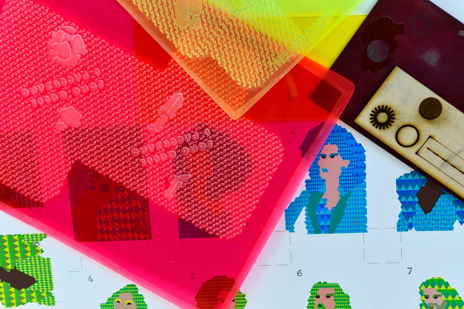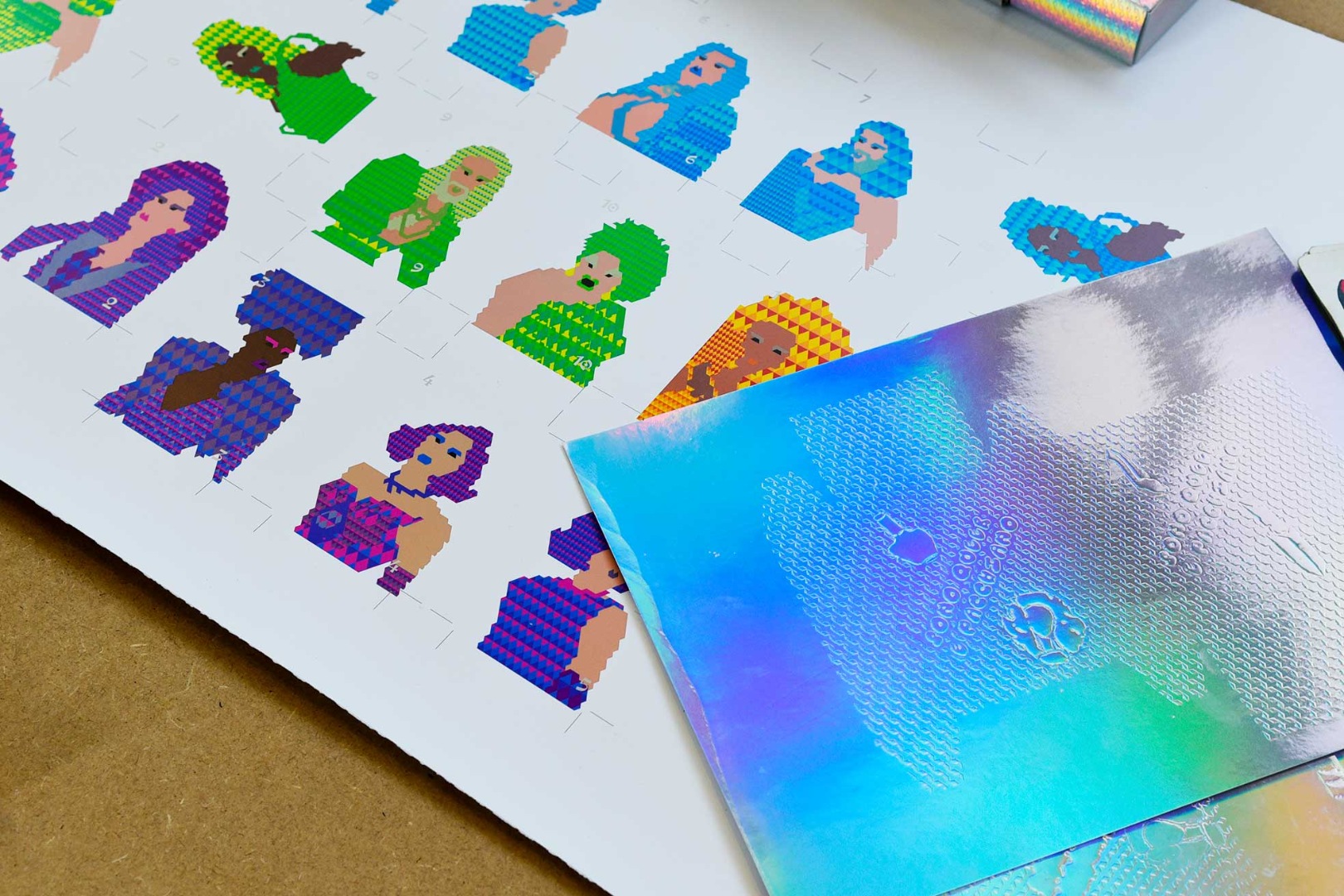 Sono queer & pacchiano est un jeu de cartes traditionnel sicilien (40 cartes) où les gravures traditionnelles sont remplacées par des portraits de drag queens. Les différentes familles sont incarnées par les couleurs. Les livrets contiennent les règles des jeux et mon article de troisième année de DNA, faisant un rapprochement entre les esthétiques traditionnelles siciliennes e t les cultures queer révolutionnaires. Leur couverture sont gaufrées à partir d’une macule gravée au laser. Le tout est dessiné et gravé à partir de motifs triangulaires, prélevés des carreti siciliani et rappelant le triangle rose.