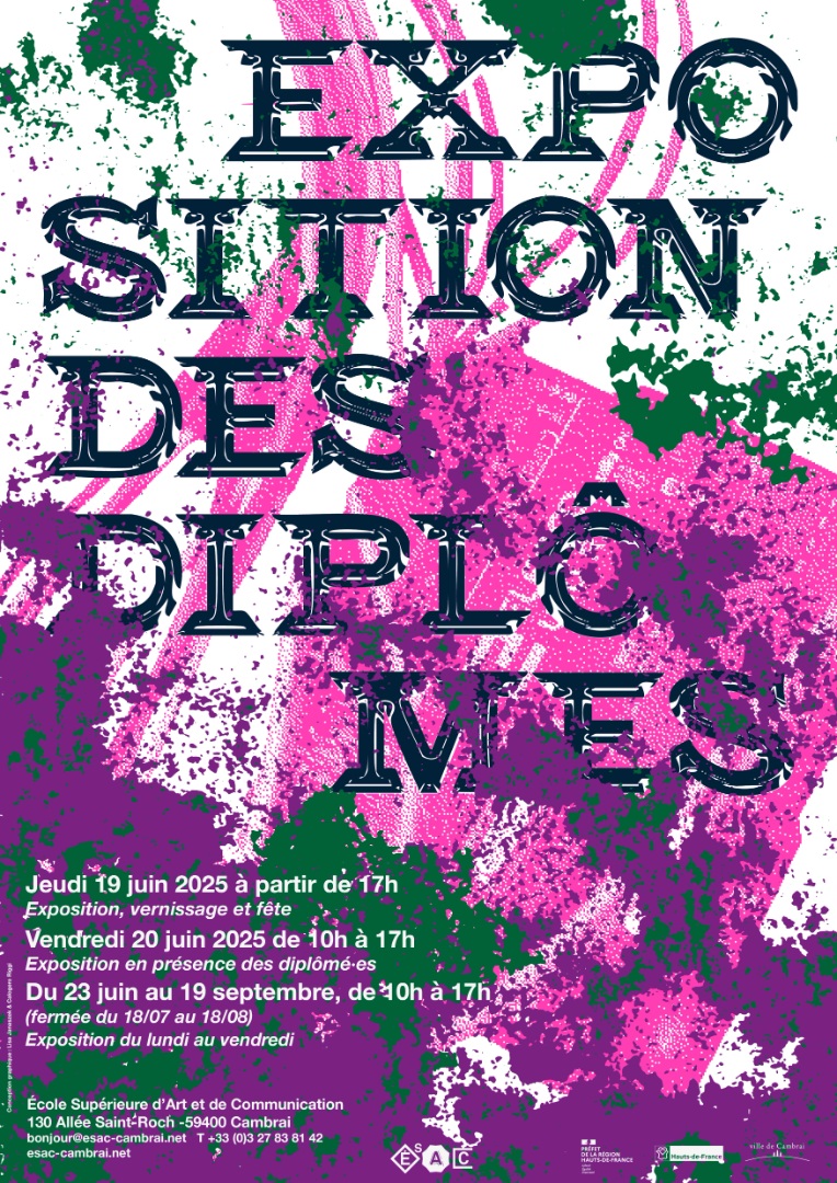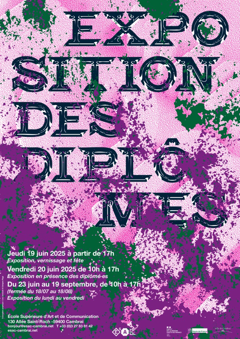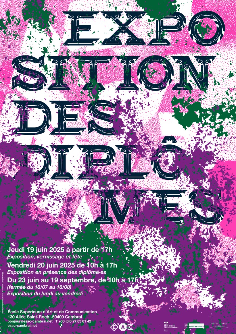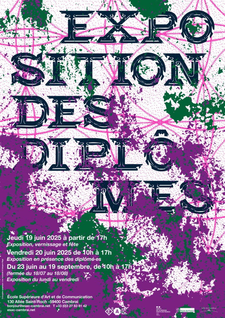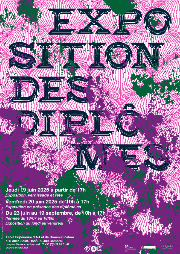 L'affiche et ses déclinaisons, réalisées en binôme, annoncent l'exposition des diplômes (2025) présente à l'Ecole Supérieure d'Art et de Communication de Cambrai pendant les vacances estivales. L'image du fond est une photo d'un dispositif d'un des sept diplômes (qui retranscrit les liens entre graphisme et numérique). Les cartons d’invitation ont été imprimés dans une entreprise locale, en trois tons directs du nuancier pantone : rose fluo, violet et vert.