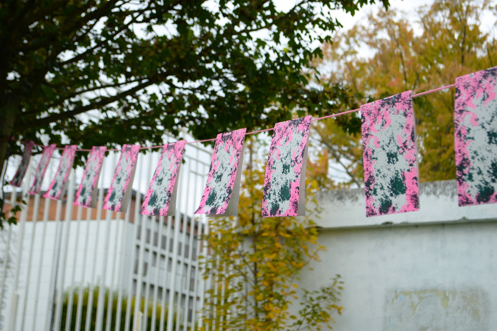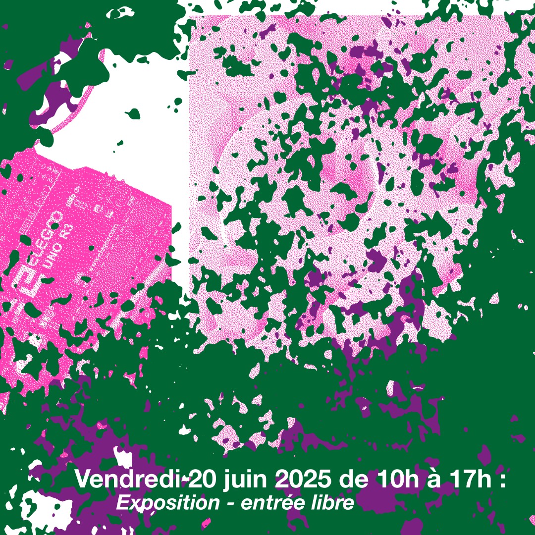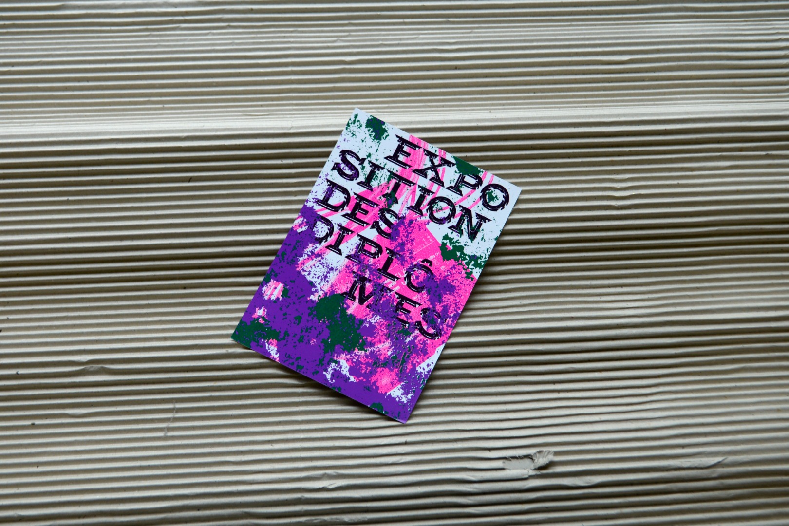 L'affiche et ses déclinaisons, réalisées en binôme, annoncent l'exposition des diplômes (2025) présente à l'Ecole Supérieure d'Art et de Communication de Cambrai pendant les vacances estivales. L'image du fond est une photo d'un dispositif d'un des sept diplômes (qui retranscrit les liens entre graphisme et numérique). Les cartons d’invitation ont été imprimés dans une entreprise locale, en trois tons directs du nuancier pantone : rose fluo, violet et vert.