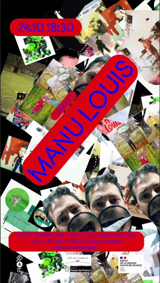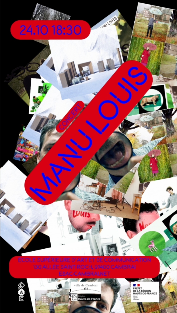 The poster announces the arrival of Manu Louis, Belgian musician, singer, and composer, at the Cambrai School of Art and Communication. It refreshes after a few seconds, revealing a new random collage of the musician's album covers. These are mixed together in much the same way as musical genres are blended in the artist's productions.