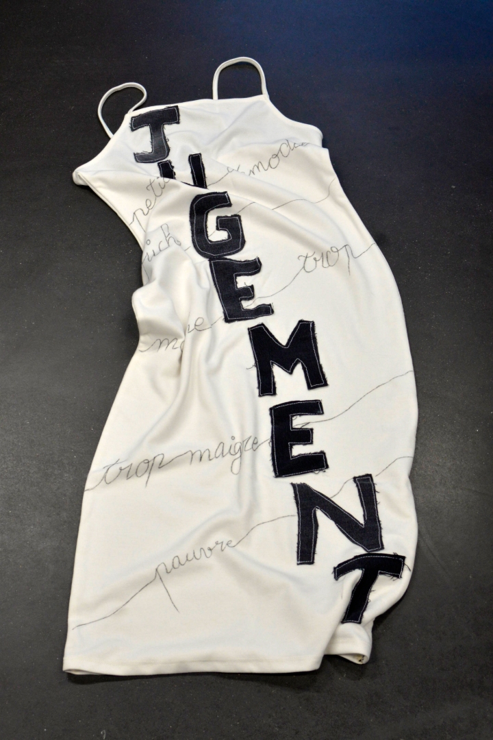 Questo capo serve a denunciare le costrizioni sociali che noi stessi imponiamo al nostro corpo. Soprattutto le donne, vittime dell'onnipresente sguardo maschile. Il titolo dell'abito è cucito su tutta la sua lunghezza. Le critiche sull'aspetto fisico circondano il capo come se lo soffocassero.